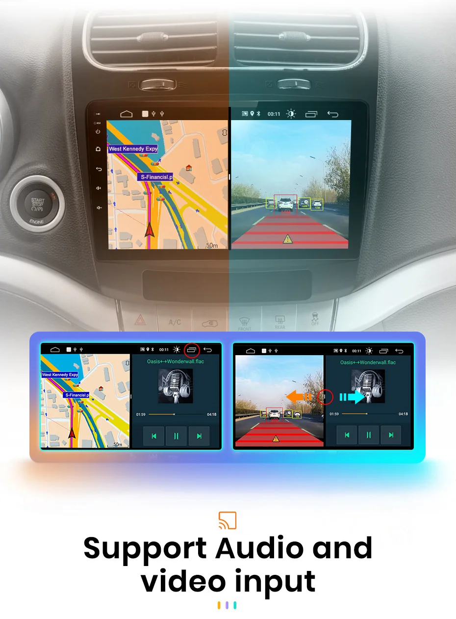It can show 2 applications on screen at the same time, easier to operate the device. For example, the device can navigate and play music at the same time when splitting screen.