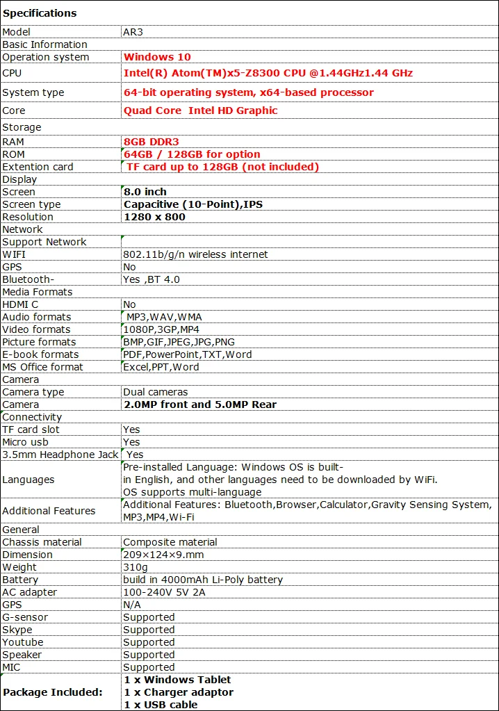 Hot Sales 64 Bit 10.1 INCH X5-Z8350 CPU 8GBRAM 128GB ROM Windows 10 Tablet PC AR10 Tablet PC 1920*1200 IPS Screen WIFI HDMI-C