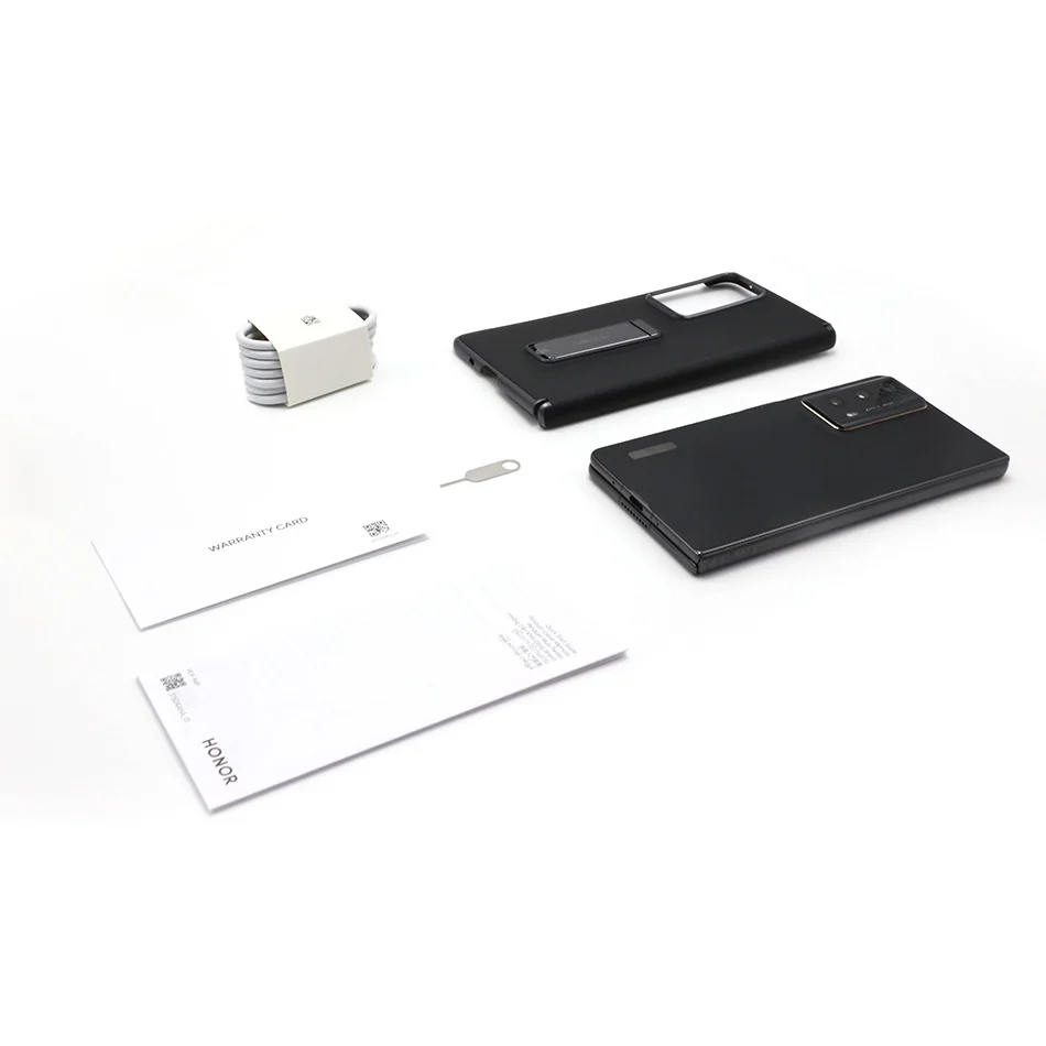 In the Box: 1. Phone with built-in battery x 1 2. HONOR SuperCharge Charger x 1 3. USB Type-C Cable x 1 4. Quick Start Guide x 1 5. SIM Eject Tool x 1 6. Inner screen protector (pre-applied) x 1 7. Outer screen protector (pre-applied) x 1 8. Warranty Card x 1 9. PU Case x 1