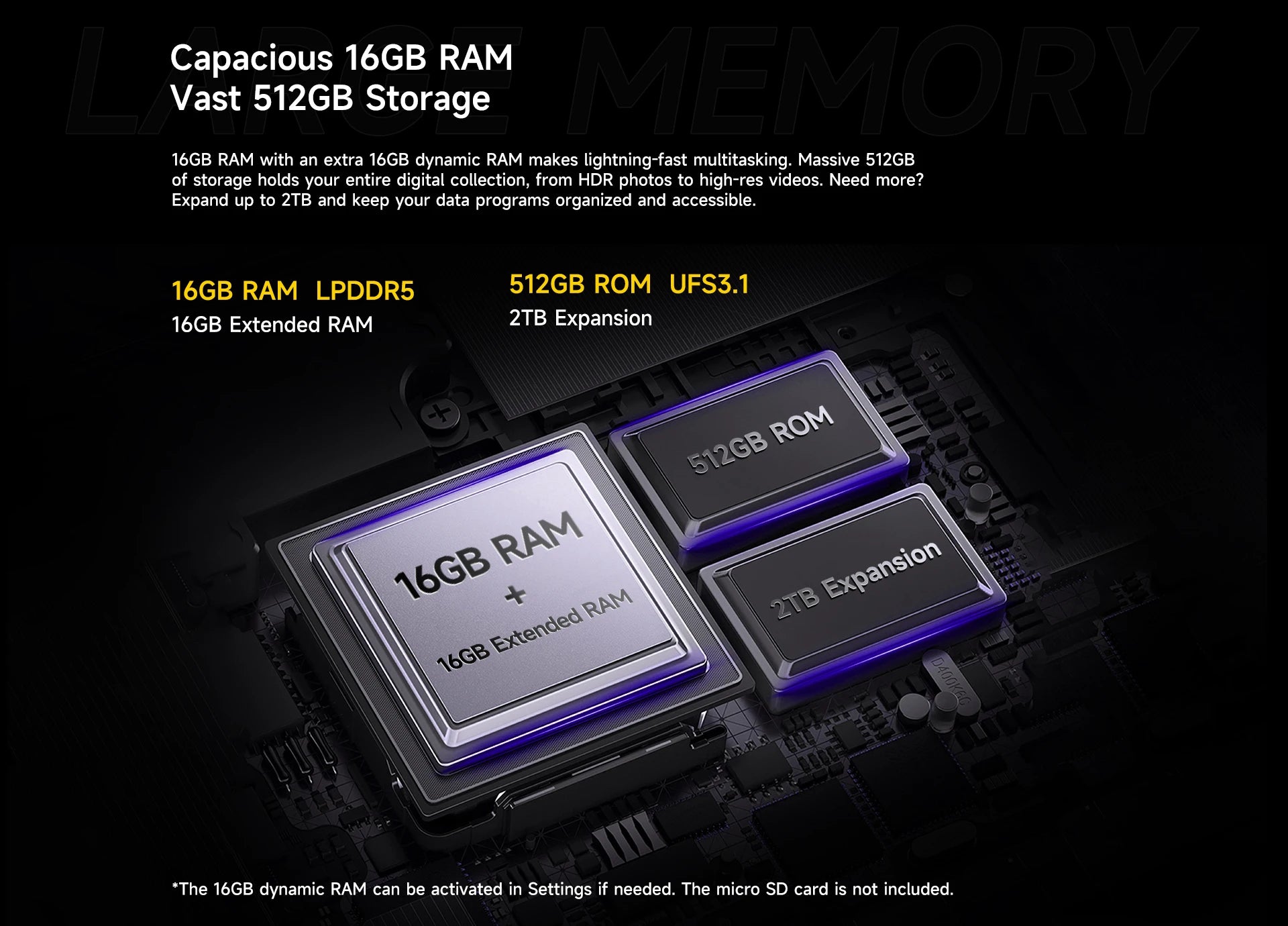 512GBROM ,32GB RAM=16GB LPDDR5 + 16GB Dynamic RAM