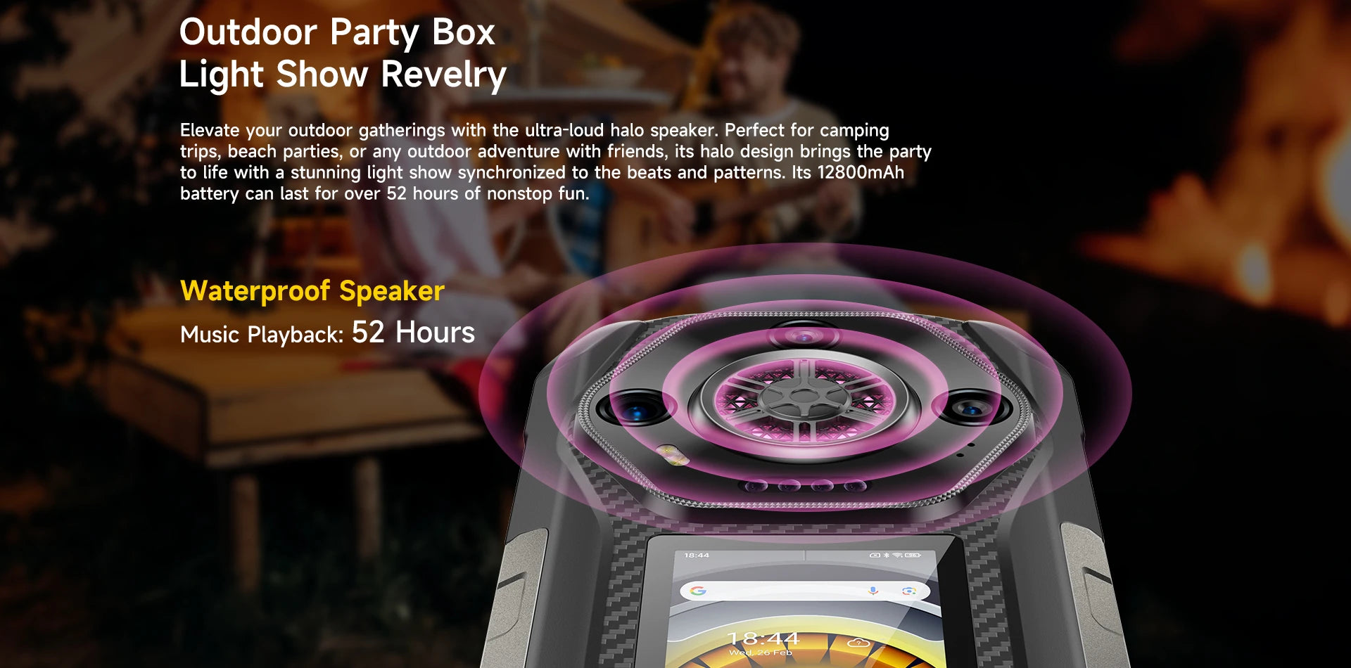 Elevate your outdoor gatherings with the ultra-loud halo speaker. Perfect for camping trips, beach parties, or any outdoor adventure with friends, its halo design brings the party to life with a stunning light show synchronized to the beats and patterns. Its 12800mAh battery can last for over 52 hours of nonstop fun.