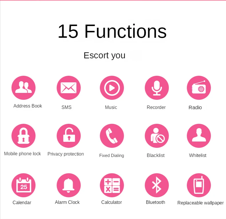 ●Functions: BT dailer,MP3 player,TF card slot,Merssage, Vibration,Calendar, Alarm, Calculator...etc.