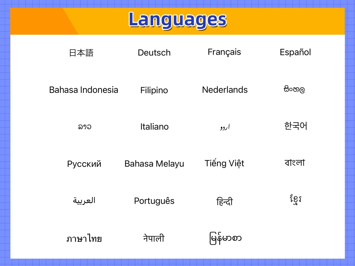 Language: Arabic,German,Russian,French,Korean,Portuguese,Japanese,Spanish,Italian,English,English,Russian,German,French,Spanish,Polish,Portuguese,Italian,Turkish,Norwegian,Korean,Japanese,Arabic