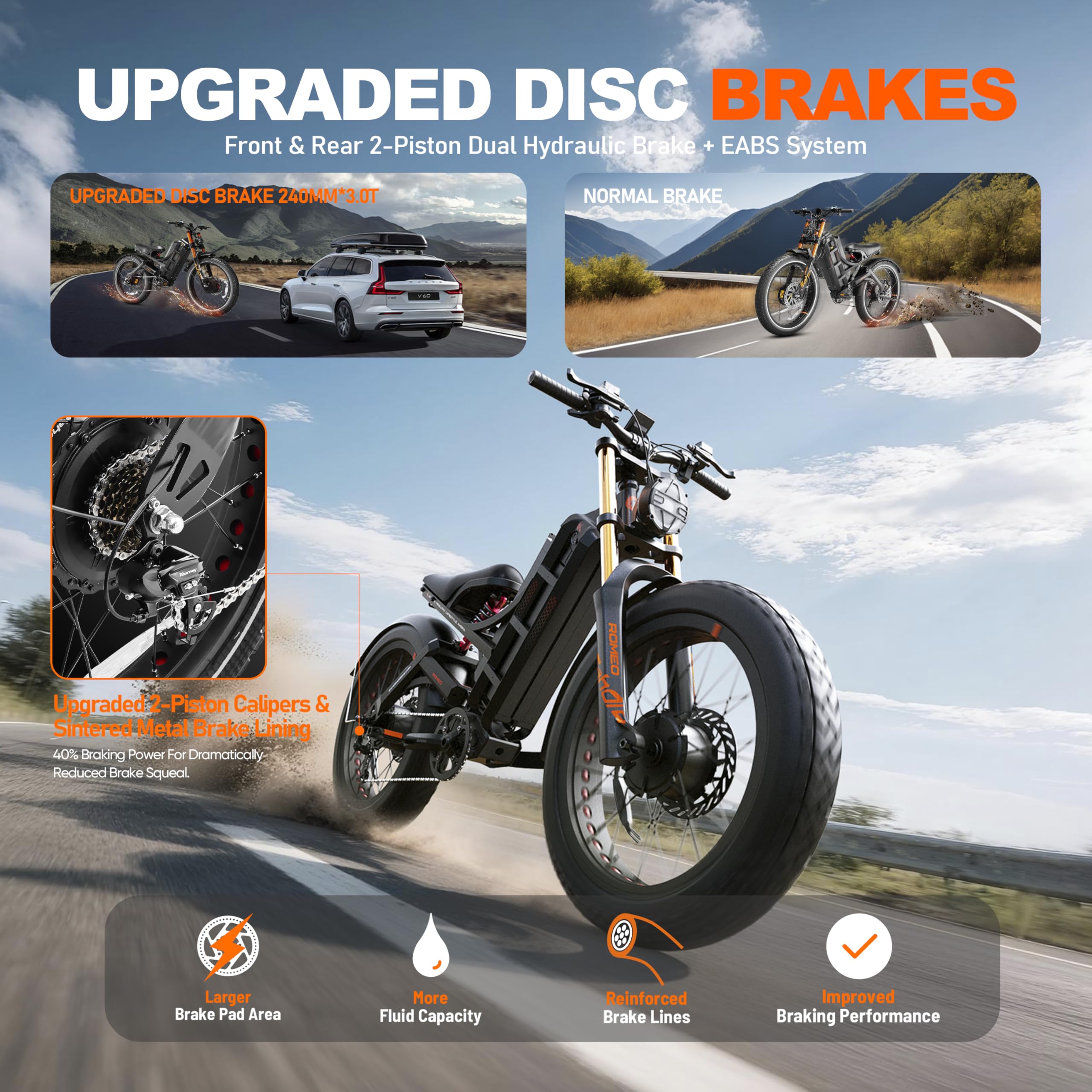 - [Excellent Brake System] Romeo Pro Ⅲ fat trie electric bike equipped 240*3.0T brake discs on both front and rear,with 2-piston oil brake calipers and thickened brake hoses. Dual-cup mineral oil prevents corrosion and ensures braking power in wet conditions, and a new process produces brake pads that are more abrasion-resistant and quieter. The entire braking system demonstrates superior braking performance(18mph/5m), allowing you to experience speed and enjoy safety at the same time!