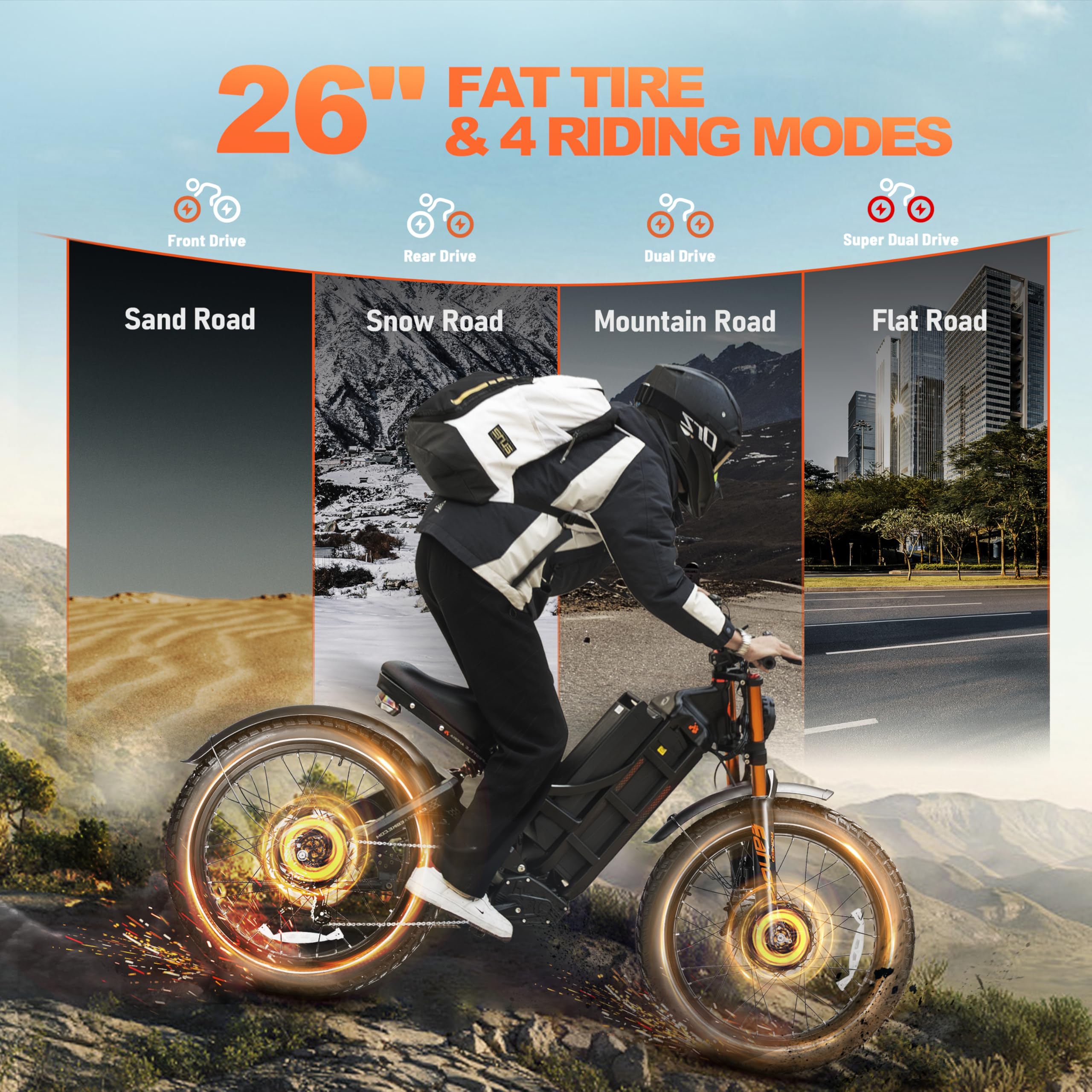 - [Beastly 5600w Dual Motors] Featuring dual 2800W motors, the Romeo Pro 3 electric bike is a dual motor ebike that can reach a top speed of 50 mph, and with 150*2 Nm of torque, it can effortlessly climb steep 50-degree hills.perfect for crushing steep mountain trails, hauling gear to campsites, or dominating urban commute.From the steep slopes of the Rockies to the gravel trails of Colorado, it's the perfect choice for weekend adventurers and outdoor enthusiasts.