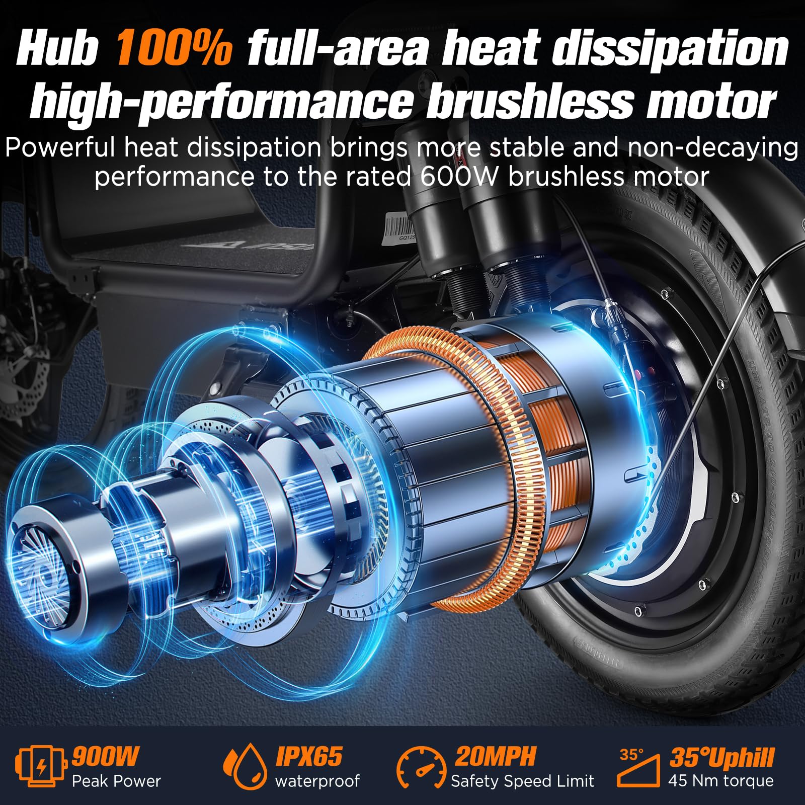 • Robust and Durable Construction:Engineered to withstand rigorous use, this electric scooter has passed a 200,000 vibration test, ensuring a reliable ride. The high-strength frame supports up to 330 pounds, making it perfect for transporting various household items. With a powerful 900W peak power, it effortlessly handles everyday tasks.