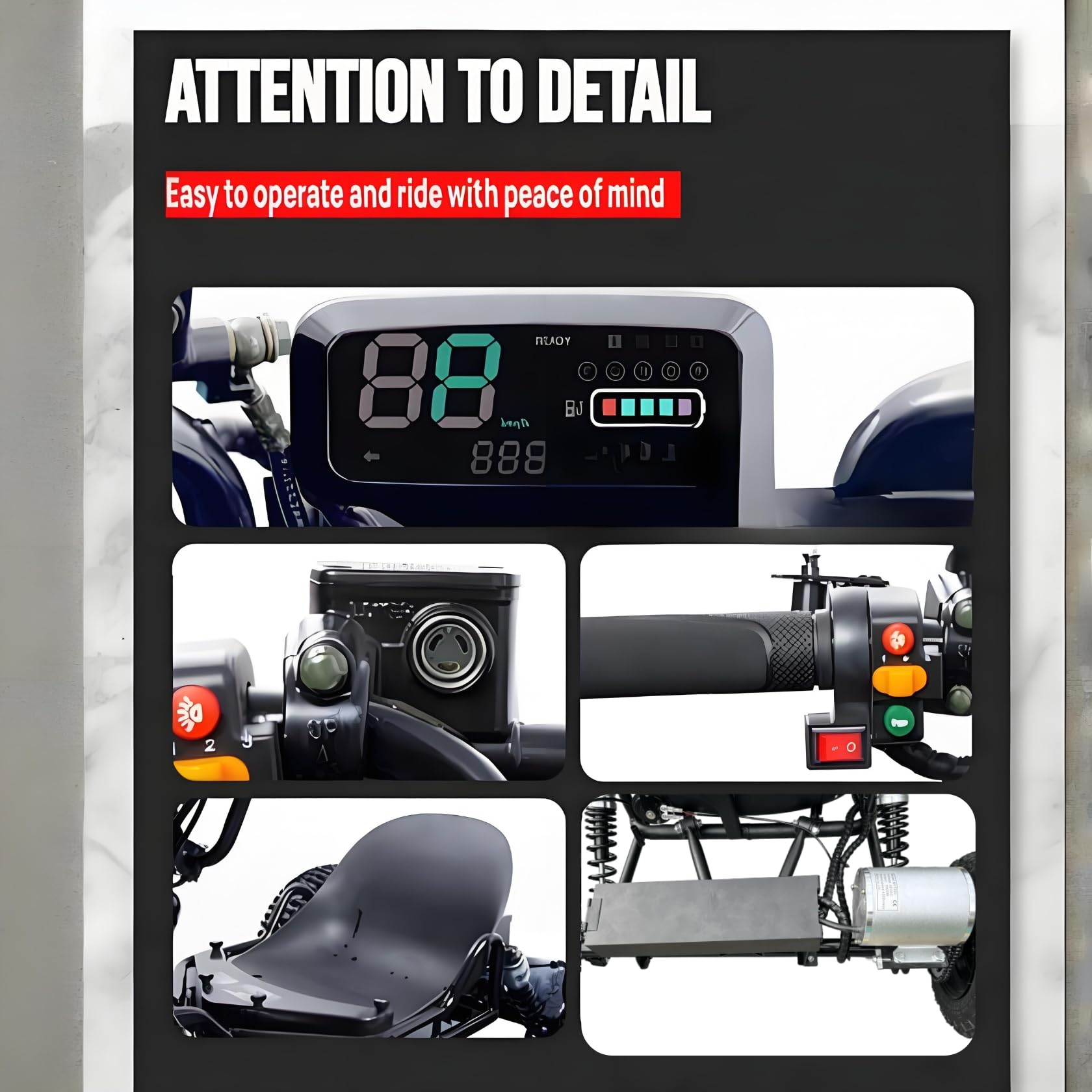 - 48V 2000W Controlled Power – High-torque brushless motor with 3 selectable modes (low/medium/high) and a speed limiter for training or performance riding.