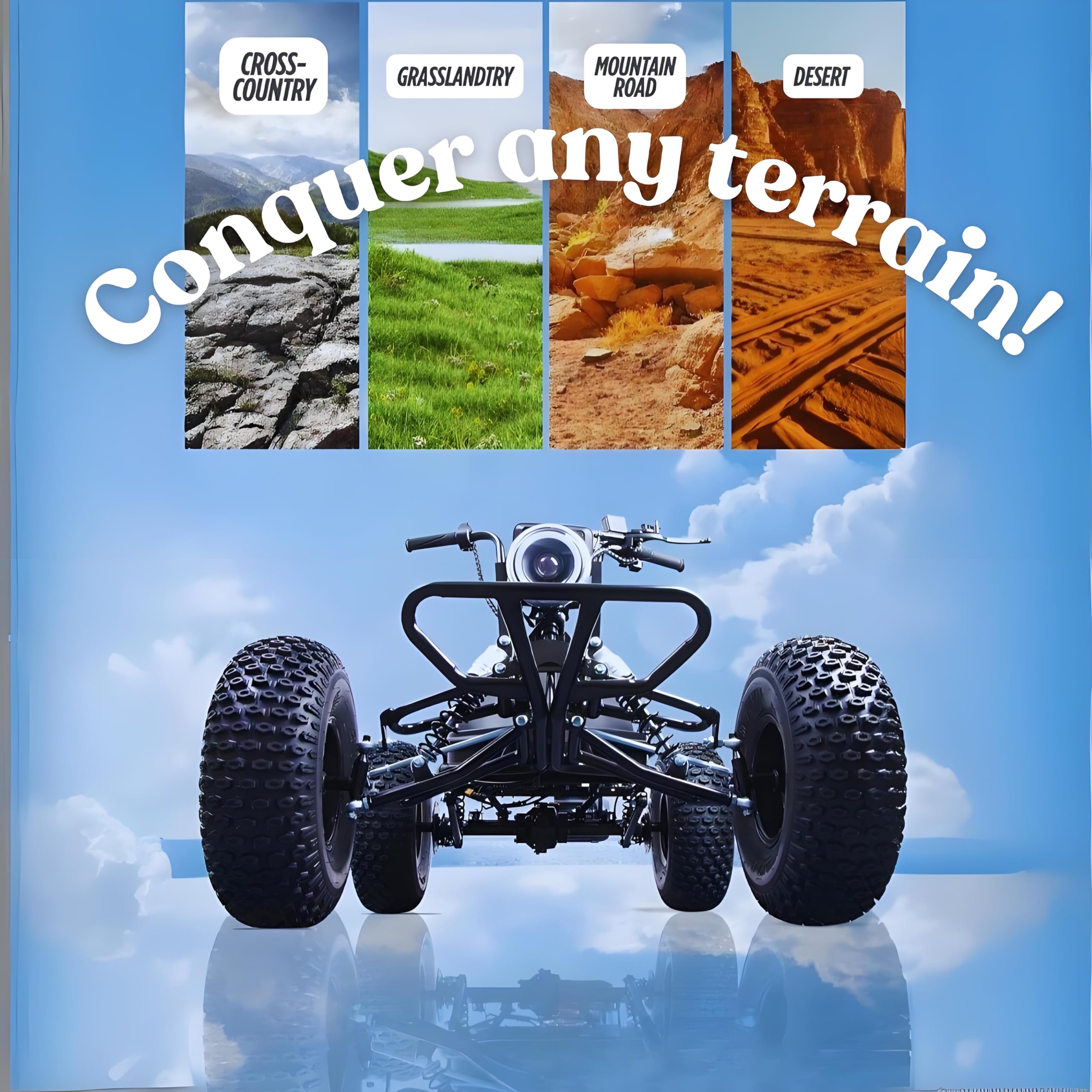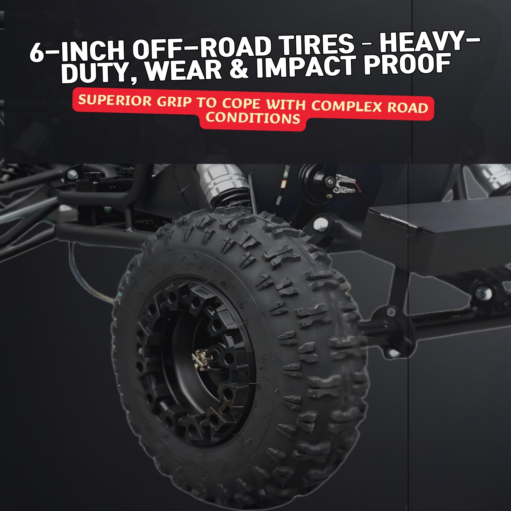 - Off-Road Capability – Chain rear-wheel drive, welded steel frame, and 6" knobby all-terrain tires track across dirt, grass, and gravel on private property.