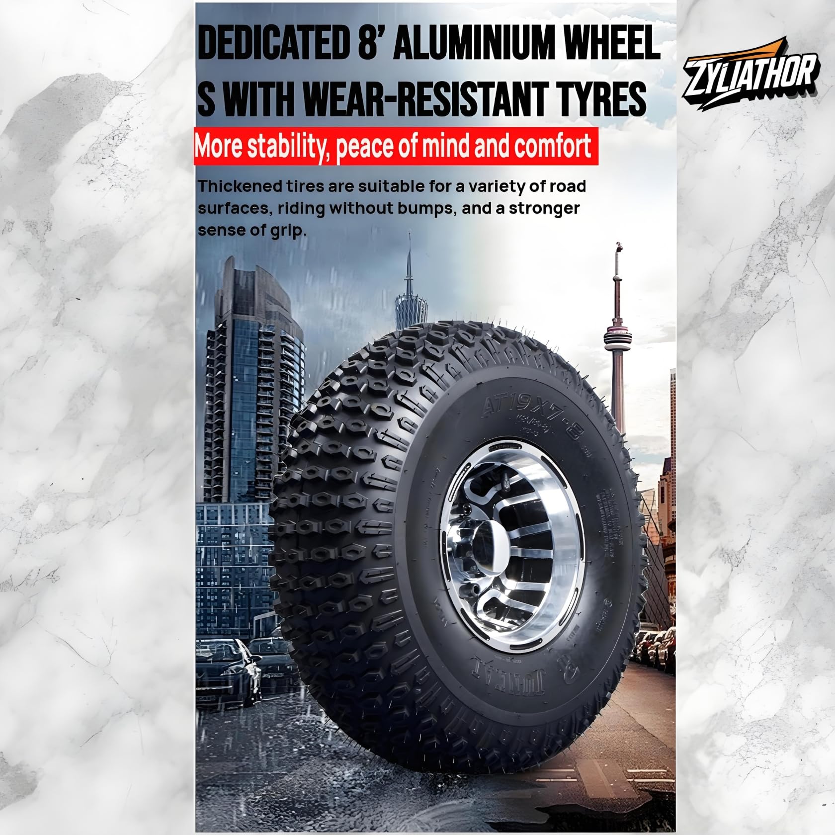 • All-terrain traction — 8" aluminum wheels with rugged tread grip dirt, grass, gravel, and light trails.