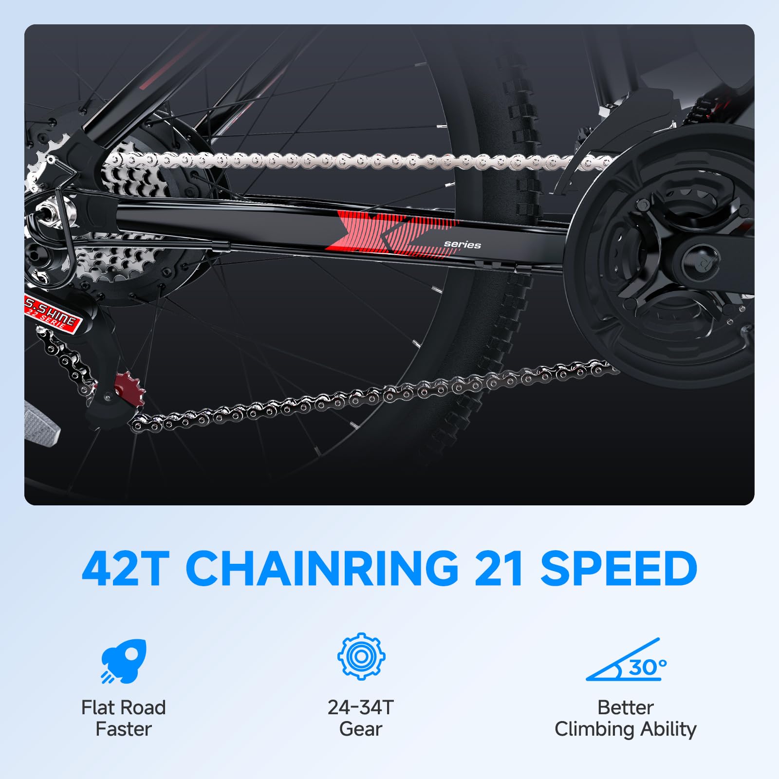 - 【Safety-Driven Design】Front fork suspension absorb any bumps or shocks encountered on rugged road, providing a smooth and comfortable riding. The 21 speed drivetrain and front and rear dual responsive mechanical disc brakes provide superior control and stopping power in any conditions. Cables are neatly integrated within the frame for added safety