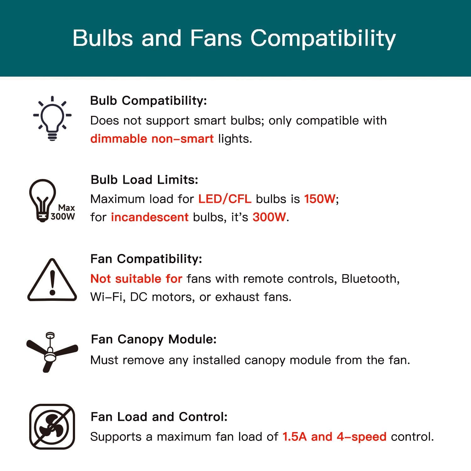- About Compatibility: The smart ceiling fan switch is designed for single-pole (not 3-way) use. Not compatible with multiple dimmers on a circuit. Not compatible with fans equipped with built-in remote control/Bluetooth/Wi-Fi systems, DC motor fans, exhaust fans, or smart bulbs. Supports a maximum ceiling fan load of 1.5A with 4 fan speed controls, and a maximum light load of 150W for dimmable LED/CFL or 300W for incandescent bulbs