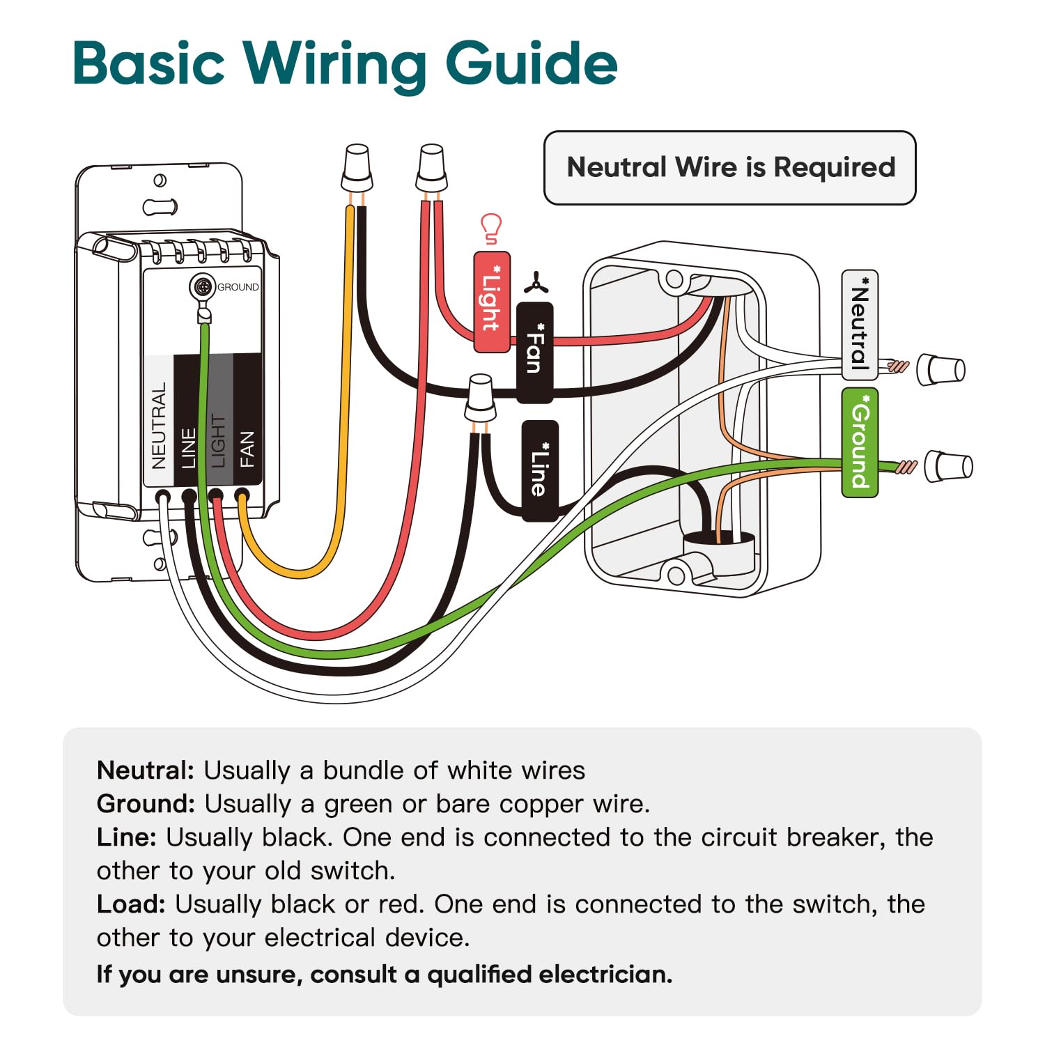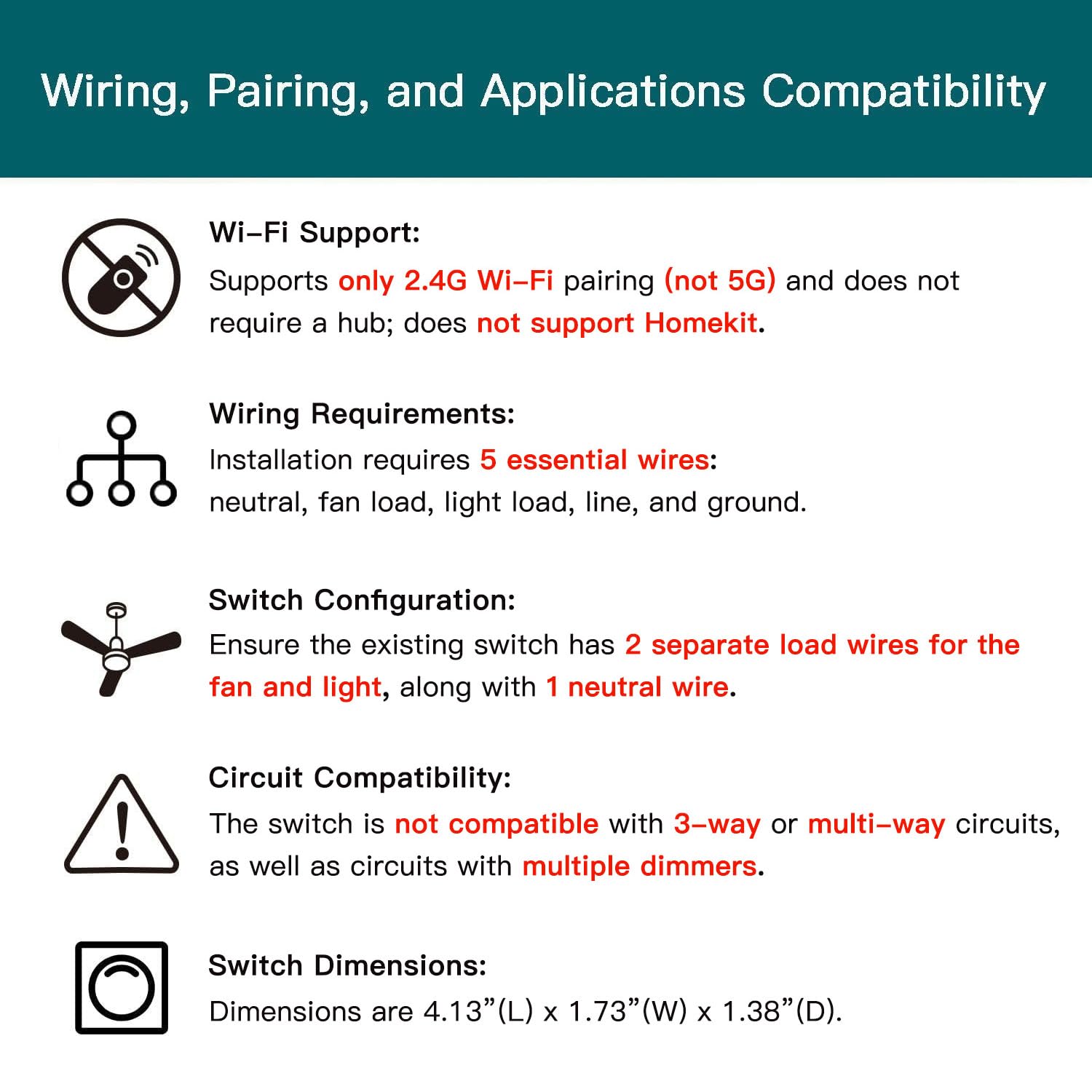 - Notes Before Buying: This fan light switch works on 2.4G WiFi only (not 5G). It requires 5 essential wires: neutral, fan load, light load, line, and ground wires. Ensure 2 separate wires for the fan and light on the old switch, and a neutral wire (homes before 1978 may lack this). No Hub or canopy module is needed, FCC-certified