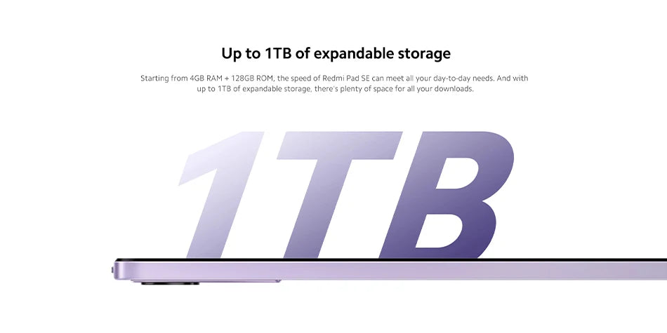 Starting from 4GB RAM + 128GB ROM, the speed of Redmi Pad SE can meet all your day-to-day needs. And with up to 1TB of expandable storage, there's plenty of space for all your downloads.