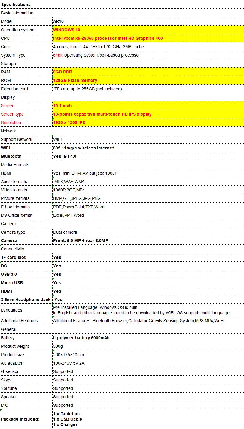 Top Sales AR10 Windows 10 Tablet PC 10 INCH 8GB RAM 128GB ROM x5-Z8300 CPU 64-Bit Quad Core 1920 x 1200 IPS Screen Dual Cameras