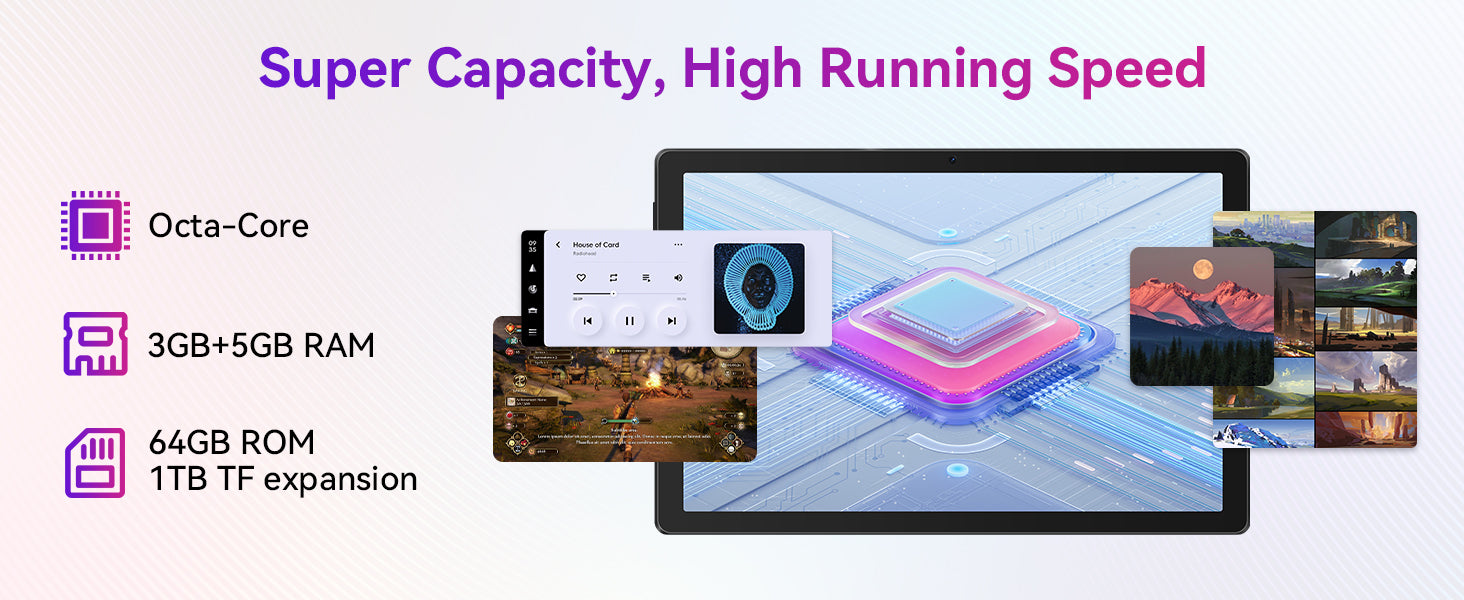 【8(3+5)GB RAM+64GB ROM+1TB Expansion】 The tablet is equipped with 8(3+5)GB RAM+64GB ROM with support for TF card expansion up to 1TB (Micro SD/TF card is not included). Works smoother and faster. Store tons of data, files and media and much more. Feel free to download and store your favorite content and say goodbye to the worry of running out of memory.