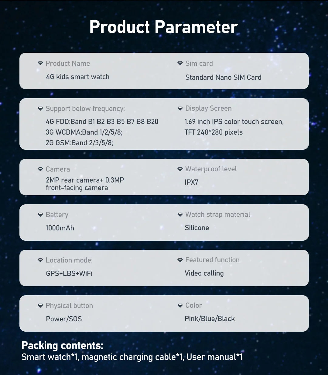 Others: No disturbing time, SMS alerts(low-voltage remind/SOS remind), Remote shutdown, Alarm clock, Watch finder,math game,Class schedule, Make friend,Camera,Rewards, Bluetooth, App store,Whatsapp,Google translate,Mp4 player,recorder.,etc