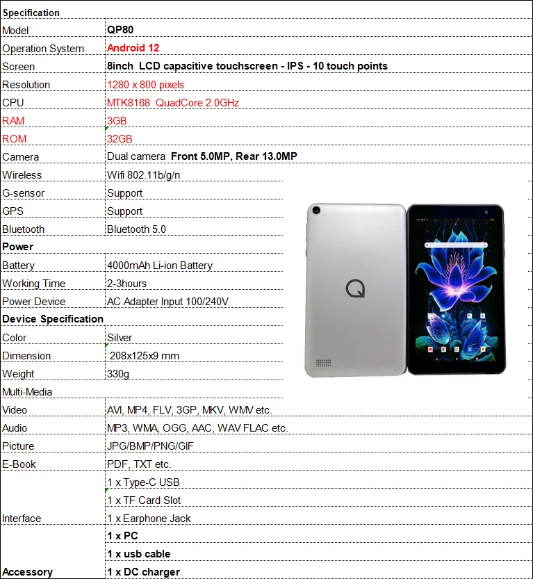 8 INCH Android 12 RAM 3GB+32GB ROM QP80 MTK8168 Tablet Quad Core IPS Screen Quad Core Rear 13.0MP WIFI Dual Camera