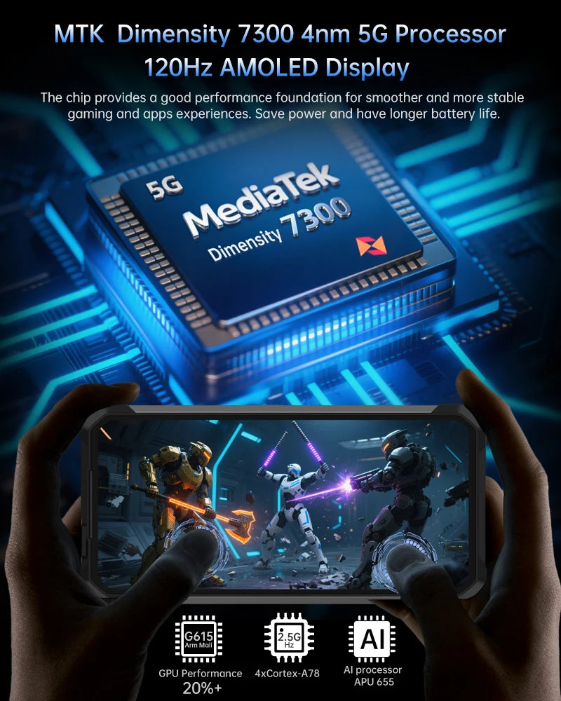 TANK 4 delivers seamless performance powered by the MediaTekDimensity7300.Enjoy immersive gaming with the Am Mali-G615 GPU, all fueled by2.5GHz Octa-Coreprocessor and efficient 4nm technology