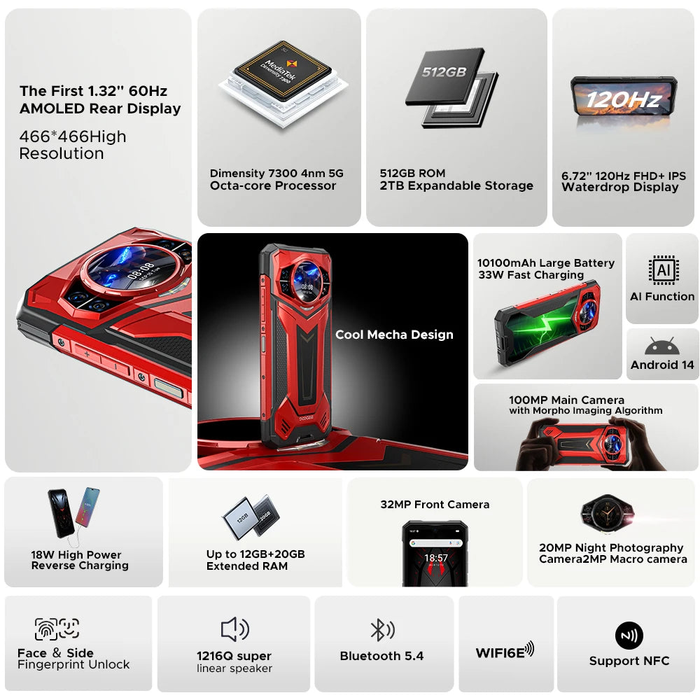 DOOGEE S200 Plus 5G AI Rugged Phone Android 15 Dimensity 7300 1.32" Rear Display 16GB 512GB 6.72'' 11000mAh Battery Smartphone