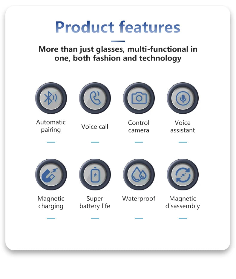 AI voice wake-up, AI photo recognition, AI intelligent question-and-answer interaction, AI smart translation, high-definition photography and video recording (with anti-shake function), recording, Wi-Fi transfer of photos, videos, and recordings to phone, slide to adjust volume, wear detection, dual microphone noise reduction, call noise reduction, intelligent voice assistant, Bluetooth calls, music playback (switch, pause music), low power consumption Jerry + Allwinner main control chip, long-lasting battery life, dual physical buttons plus slide touch for convenient operation, 39 grams lightweight overall weight for comfortable wearing, customizable sunglasses, blue light protection, color-changing, myopia, and other lenses, .{need to be customized}