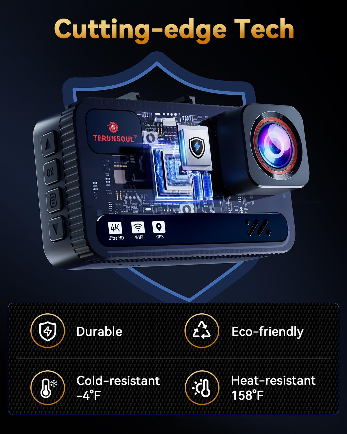 • Ultra HD 4K Front + 4K Rear Recording: The Terunsoul dash cam supports dual-channel simultaneous recording, capturing both front and rear footage. Both cameras record in 3840×2160P, ensuring clear footage of the road ahead and behind. The front camera features a 170° ultra-wide-angle lens, providing full coverage of six-lane roads and capturing more road details with this 4K dash cam