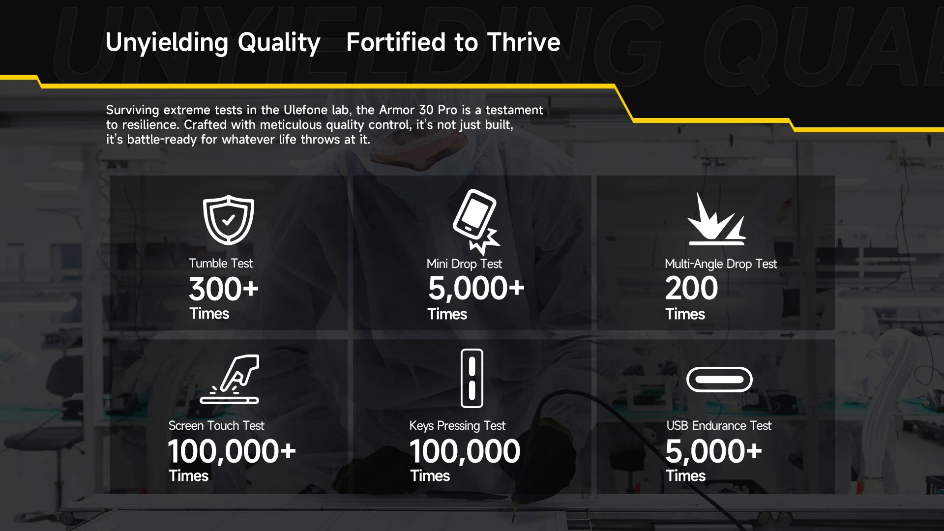Armor 30 Pro is splash, water, and dust resistant and was tested under controlled laboratory conditions with a rating of IP68 under IEC standard 60529 (maximum depth of 1.8 meters up to 30 minutes). Charger and accessories are not water-resistant. Splash, water and dust resistance are not permanent and might decrease as a result of normal wear. Do not attempt to charge a wet Armor 30 Pro. Liquid damage not covered under warranty.