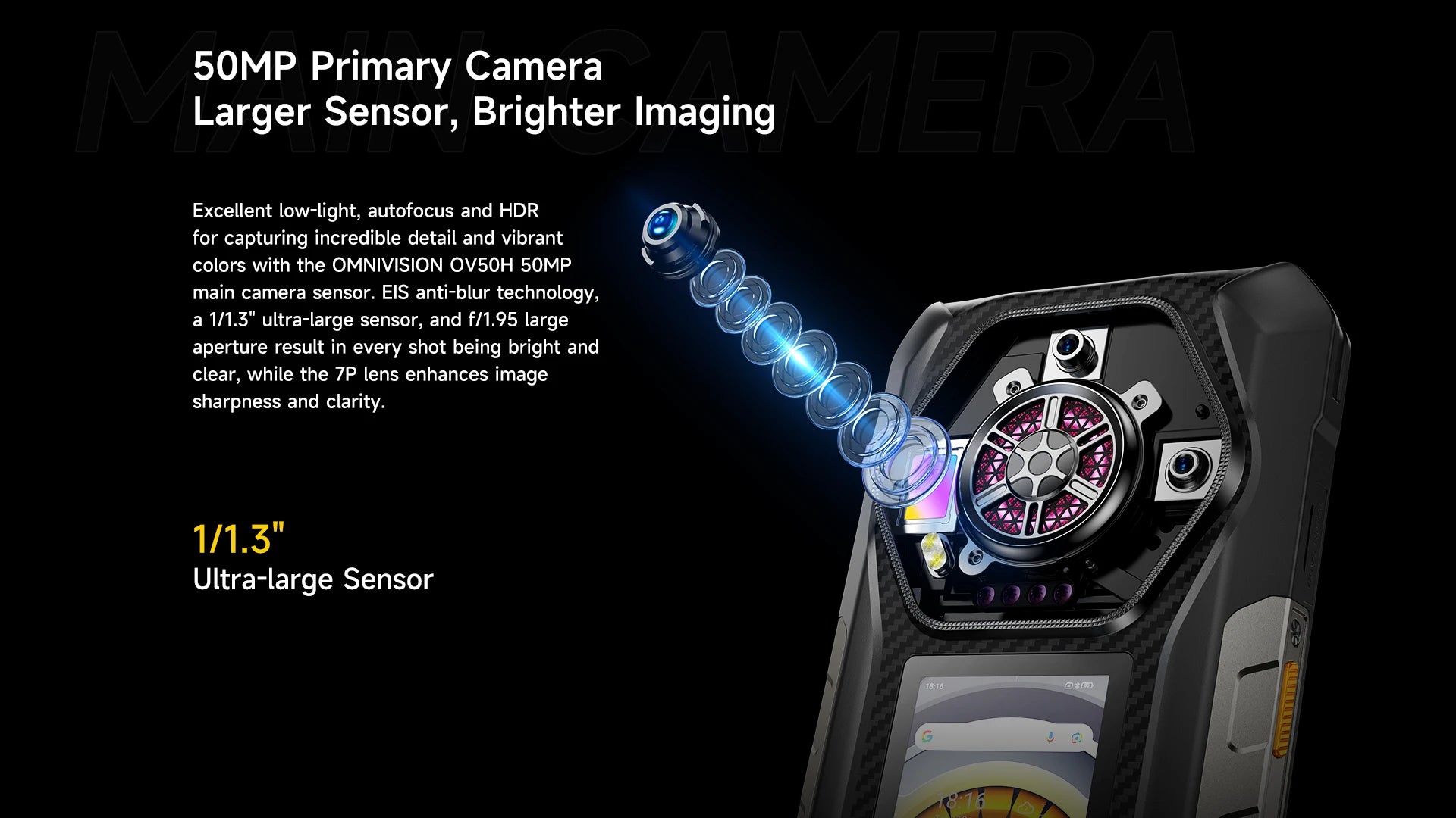 Excellent low-light, autofocus and HDR for capturing incredible detail and vibrant colors with the OMNIVISION OV50H 50MP main camera sensor. EIS anti-blur technology, a 1/1.3" ultra-large sensor, and f/1.95 large aperture result in every shot being bright and clear, while the 7P lens enhances image sharpness and clarity.