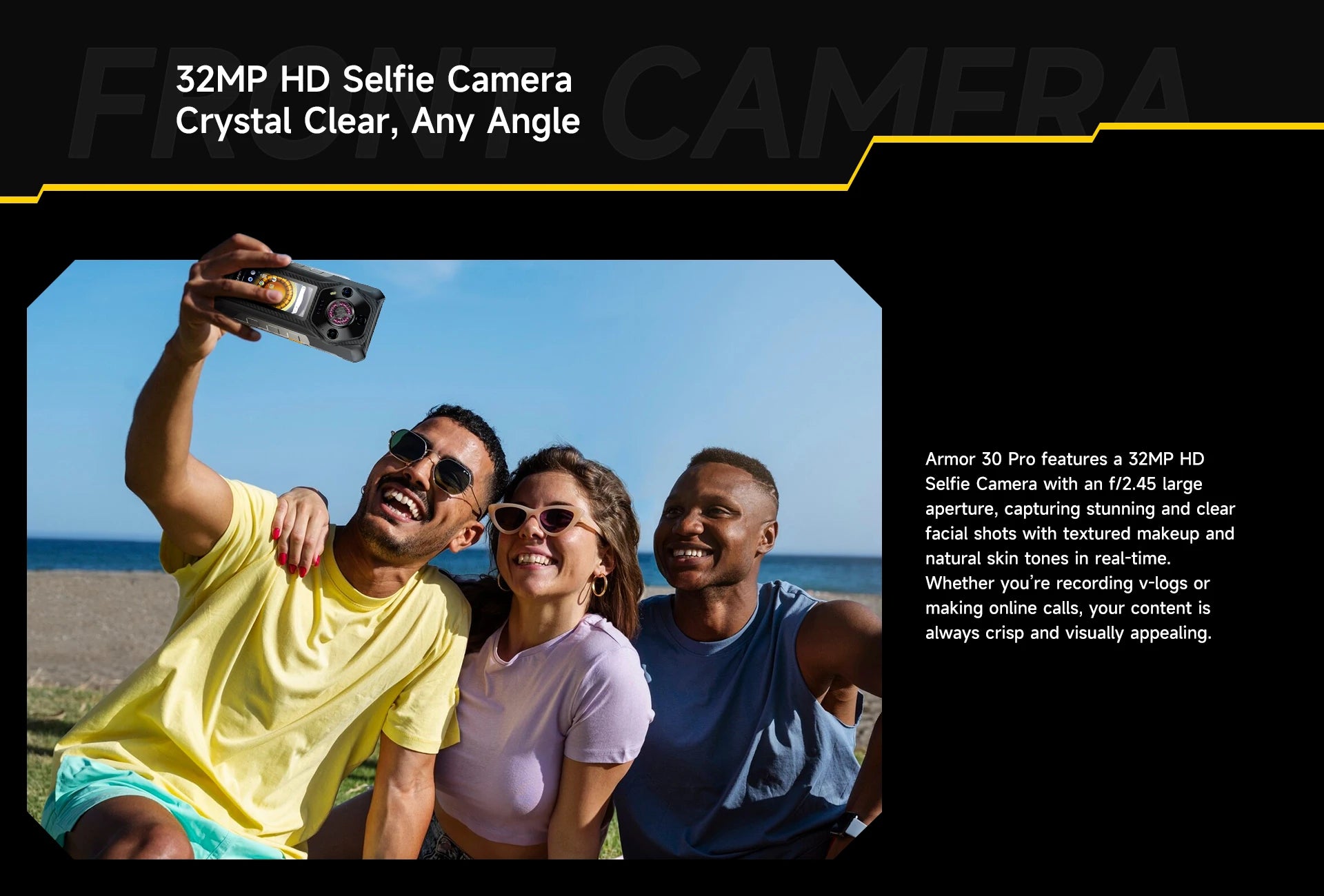 Armor 30 Pro features a 32MP HD Selfie Camera with an f/2.45 large aperture, capturing stunning and clear facial shots with textured makeup and natural skin tones in real-time. Whether you’re recording v-logs or making online calls, your content is always crisp and visually appealing.